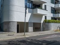 Modern architecture in Berlin under a clear sky. Urban design elements contrast with traditional residential buildings. Hard shadows create a dynamic cityscape on a sunny European day.