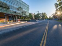 This photo captures a wide, empty street in Los Angeles, California. The modern architecture of the large building on the left contrasts with the natural elements of the trees in the middle. The clear sky and bright sunshine create hard shadows on the road, showcasing the urban design of the city. This image represents a typical sunny day in the bustling urban environment of Los Angeles, USA.