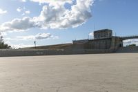 A view of a parking garage in downtown Los Angeles, California. The modern architecture and concrete structure create a dramatic urban landscape. The city's skyline is visible in the distance, with the dry riverbed adding an industrial touch to the scene.