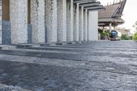 A modern architecture building with a concrete facade stands tall in the urban city of Solidaridad, Mexico. The walkway leading to the hotel is lined with trees and cobblestone, creating a recreational and inviting plaza in the city center.