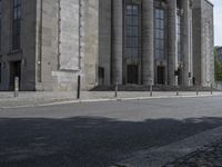 This stock photo features a charming urban city street with cobblestones on the side and columns on each side of it. The architecture showcases a mix of modern and Brutalist styles, with buildings lining the road. The street is paved with asphalt, and trees add a touch of greenery to the scene. The facade of the buildings exhibits unique designs, while the columns add an elegant touch. The road surface is well-maintained, providing a smooth pathway for pedestrians and vehicles. This image captures the essence of city life and showcases the material properties of urban environments. The photo was taken near Volksbühne, adding a touch of local flavor to the scene.