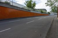 a city street with an orange wall on it and a concrete road lined by trees