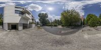 Berlin cityscape showcasing modern architecture and urban design. Asphalt roads with hard shadows under a cloudy European sky. Residential buildings cast sharp profiles in the city's urban landscape.