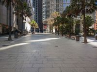 Urban cityscape at dawn, with tall office buildings casting hard shadows on the road. Clear sky contrasts with the urban vegetation of palm trees lining the sidewalk. A glimpse into urban design and city life.