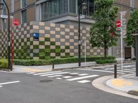This stock photo features a view of modern urban design in Tokyo, Japan. The image showcases a busy city street with asphalt roads, a well-marked crosswalk, and various office buildings. The bustling business district is alive with city life and activity, revealing the vibrant energy of Tokyo during the day. The scene captures the essence of urban living, combining modern architecture and the dynamic street crossing in this cosmopolitan city.