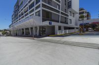 A modern condominium building in the city, featuring a sleek asphalt road surface and parking spaces along the sidewalk. The building's facade showcases urban design with large windows.