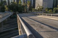 A stunning cityscape of downtown Los Angeles at dawn. The modern architecture and skyscrapers create a striking urban design. Clear skies illuminate the city, highlighting the bustling city life and the thriving business district.