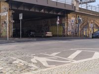 Berlin's urban design shines through in this scene. A classic architecture bridge serves as an underpass, adorned with vibrant graffiti. Cars and bicycles seamlessly navigate the city's thoroughfares.