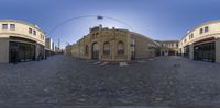 A classic architectural scene in Berlin, Germany. Cobblestone streets and brick walls create a charming urban atmosphere. Sun casts hard shadows on the straight road leading to a parking lot. City life merges with warehouse storage in this bustling business district.