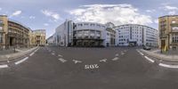 a panorama shows a street in front of several buildings with a sky background as well as two roads