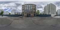 A fisheye lens captures the vibrant architecture of Berlin's cityscape. Classic and modern buildings line the straight road, leading to an open courtyard. Clear skies and urban design create a picturesque scene in the heart of Europe.
