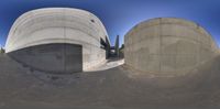 two circular concrete shapes, with a ramp, a building and an empty area in the back ground