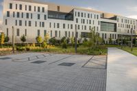 This is an image of a modern office building in the business district of Toronto, Canada. The building features a sleek design with large windows that reflect the cloud-filled sky. Surrounding the building are well-maintained grassy areas, adding a touch of green to the urban landscape. The concrete surfaces create a clean and modern aesthetic. This photo captures the dynamic and bustling atmosphere of Toronto's urban environment, where architecture and business are seamlessly integrated.