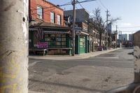 A clear sky day in Toronto's Kensington neighborhood. Classic architecture and suburban streets with overhead power lines and street lights create a charming cityscape. Art district in the foreground adds to the vibrant city life.