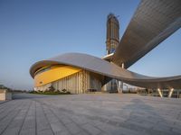 A modern architecture building in a city at dawn. The facade is made of composite materials and features large windows. The surrounding landscape is filled with vegetation and open spaces. An urban design masterpiece.