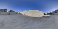 A modern architectural marvel in Zaragoza, Spain. The concrete walls and straight road provide a symmetrical urban design. The clear sky casts hard shadows on the buildings, creating a dramatic effect. The man skating on the ramp adds a touch of art to this urban landscape.