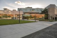 a large building that has a glass and stone facade in it's center of a grassy area near many trees