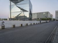 A view of a modern glass-walled office building at dawn in Berlin, Germany. The urban design of the city is highlighted by the high-rise skyscrapers and the clear sky. The surface of the road and the asphalt plaza enhance the metropolitan feel.
