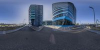 Two buildings with contrasting architecture stand near a highway in Holland. The sky is visible through the glass facade. This modern cityscape blends concrete, metal, and glass in a symphony of urban design.