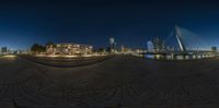 A fish eye view from the water's edge in Holland, Netherlands. Modern architecture and high-rise buildings dominate the cityscape. The clear sky reflects in the calm lake. A perfect day to explore the urban design of this metropolitan area.