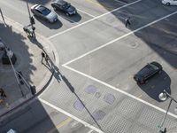 Top down view of downtown Los Angeles, California. Classic architecture and urban design can be seen from this elevated perspective. Busy roads and pedestrian crossings show the hustle and bustle of city life.