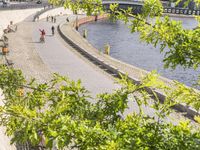 A sunny day in Berlin, Germany. Modern architecture and urban design blend seamlessly with nature. The city's architecture reflects its coastal location, with a river, lake, and pier. Trees and grass provide a green foreground.