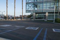 A modern architecture building in the city, surrounded by open spaces and parking lots. Clear sky illuminates the concrete surfaces and asphalt roads. This urban design creates a vibrant public space in the business district.