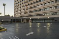 This is an image of a modern high-rise building in Los Angeles, California. The architecture features sleek lines and large windows. The building is surrounded by a spacious courtyard with trees and vegetation. In the foreground, there is a parking garage with multiple levels of concrete parking decks. The road surface in front of the building is made of asphalt. This photo captures the urban design and open spaces of Los Angeles, blending modern architecture with natural elements. It represents the vibrant and dynamic city life of California.