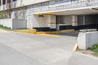 an empty parking garage with a yellow curb and some signs above the door and side of a building