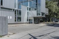 This is an image of a modern office building in the business district of Toronto, Canada. The architecture features a combination of glass, metal walls, and a sleek facade. The building stands tall in the urban landscape, surrounded by other residential and commercial properties. The parking lot in front is made of asphalt, providing a surface for vehicles. The city comes alive during the day, with people going about their city life. This photo captures the essence of urban design and the real estate industry in Toronto's business district.