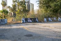 A sunny day in Los Angeles, California. The cityscape showcases a mix of urban design and rugged charm. A vibrant graffiti wall adds color to the low-rise buildings and parking lots. A perfect representation of the city's artistic and lively atmosphere.