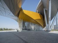 This image showcases the exterior of a modern architecture building in a bustling metropolitan area. The building features curved walls and arches painted in a vibrant yellow color, creating a visually striking facade. The design incorporates open spaces and composite materials, exuding a futuristic aesthetic. The hard shadows and shading provide a play of light and shadow on the concrete surface. Adjacent to the building is a public space, adding to the urban atmosphere. This architectural masterpiece stands tall in the cityscape, making it a prominent landmark in the business district. Experience the art of urban design with this stunning structure.