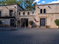 a large beige building with an open entry way leading to a restaurant and restaurant entrance