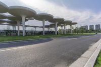 A modern urban landscape in Suzhou, China. The road is lined with silver trees, leading to a futuristic glass building with tall columns and windows. Clear skies and urban design create a vibrant city scene.