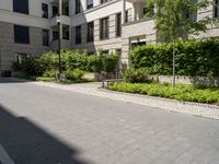 This photo captures the essence of urban life in Berlin, Germany. The image showcases a modern residential building surrounded by a well-designed urban landscape. The road surface is made of cobblestone, adding a touch of old-world charm to the city. Lush green grass and trees provide a refreshing contrast to the urban architecture. The hard shadows cast by the buildings create interesting patterns on the pavement. This picture perfectly captures the blend of modern and traditional elements in Berlin's urban design.