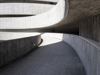 This image captures the modern architecture and urban design of a city in Spain. The monochrome composition showcases a concrete building with a unique stairwell that leads to a tree-lined street. The straight lines and composite materials used in the construction give it a contemporary and minimalist look. The white surface of the building stands out against the surrounding urban infrastructure. This photo represents the combination of Brutalist architecture and city life in Europe. The cityscape also features a ramp, highway entrance, and factory in the distance. It could be a museum or an industrial space. The location could be Tenerife, Spain.