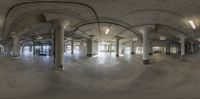 an empty, empty room with a big arched ceiling and concrete pillars, along with the entrance to another room