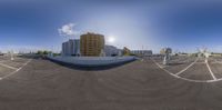A sunny day in Berlin, Germany. The urban landscape features modern architecture and straight roads. The parking lot is surrounded by tall buildings, creating a bustling city atmosphere.