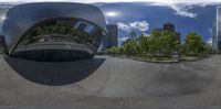 A one-point panoramic view of Taipei City, Taiwan. Futuristic high-rise buildings with glass and metal walls dominate the skyline. The clear sky reflects on the modern architecture, creating a symmetrical and sleek urban design.