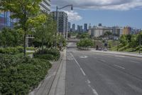 A bright day in Toronto, Ontario, Canada, showcasing the modern architecture and urban design of the city. The image features a road with buildings in the background, surrounded by trees and vegetation. The high-rise buildings and skyscrapers create a stunning cityscape, while the street lights illuminate the road surface. The clouds in the sky cast shadows, adding depth to the scene. The top-down perspective highlights the elevated infrastructure and the hard shadows created by the buildings. This stock photo captures the essence of urban life and the impressive architectural features of Toronto.
