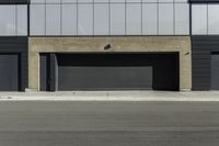 This image captures the urban design and modern architecture of a residential building in Toronto, Canada. The low-rise structure features a grey facade with windows on top and garages on each side of the sidewalk. The open space in front of the building provides a suburban feel within the city. The clear sky and the low angle of the sun create an interesting play of shadows on the asphalt road surface. The combination of composite materials and wood in the building's construction adds a touch of contemporary style. This photo represents the unique urban landscape and architectural design found in Toronto.