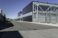 This is an image of a large industrial building in Toronto, Canada. The modern architecture of the building stands against a clear sky. The building's facade and windows cast hard shadows on the road surface below. The surrounding area is a suburban neighborhood with parked cars in the parking lot. This photo showcases the urban design and architecture in Toronto, capturing the essence of a sunny day in the metropolitan area.
