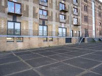 an empty parking lot in front of some buildings with ladders hanging from the side