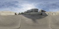 A modern skate park in Zaragoza, Spain. The elevated concrete surface casts hard shadows under the high position of the sun. The straight road leading to the park adds depth to the urban design.