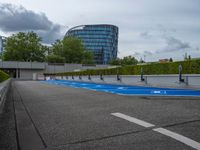Modern architecture in Hamburg, Germany's bustling business district. Electric charging stations in the urban landscape. Clouds dot the clear day sky over the city's office buildings and parking decks.