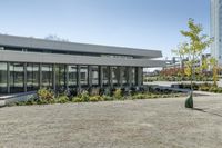 This is an image of a modern architectural high-rise building in the business district of Toronto, Canada. The building is made of concrete and features a plaza with open space and vegetation. The clear sky above contrasts with the urban landscape below. The image captures the essence of city life and urban design. The surface of the plaza is covered in gravel and cobblestone, providing a shaded area for pedestrians. This photo represents the bustling business atmosphere and real estate opportunities in Toronto.