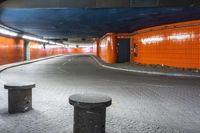 A modern architecture building in Berlin, Germany. The city's urban infrastructure includes multicolored parking garages and underground waste containers. Brick-lined roads curve through the city, while gas fixtures and waste containers line the streets.