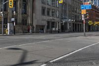 This stock photo showcases a vibrant urban intersection in Toronto, Ontario, Canada. Two people patiently wait on the sidewalk as traffic slowly moves on the empty street. The modern architecture of office buildings can be seen in the background, reflecting the bustling city life of the business district. The clear sky and well-designed urban infrastructure create a pleasant and inviting atmosphere in this metropolitan area.