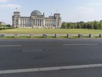 This image captures the impressive architecture of the Reichstag Building in Berlin, Germany. The modern facade stands out against the clear sky and is complemented by the surrounding park area. The well-maintained road surface and asphalt paths lead towards the building, creating a sense of urban connectivity. The lush vegetation and grass add to the overall greenery of the scene. This photo showcases the combination of traditional and contemporary elements that define Berlin's architectural landscape.