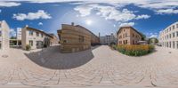 A classic brick wall in Berlin's urban landscape. The straight road leads to an open space with a clear sky. The city's architecture, including a hotel and museum, is showcased alongside the warehouse and courtyard. Hard shadows add depth to the image.